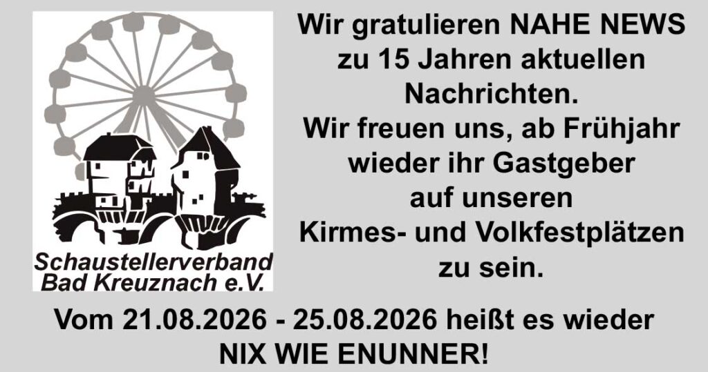 15 Jahre, unzählige Geschichten, starke Stimmen und klare Positionen – und eine Botschaft: Dieses Medienportal ist gekommen, um zu bleiben. Was einst als kleine Idee begann, ist heute eine feste Größe in unserer regionalen Presselandschaft. Nahe News steht seit 15 Jahren für verlässlichen Journalismus und echte Nähe zu den Menschen. Zu diesem besonderen Jubiläum gratuliere ich herzlich. Es ist eine beeindruckende Leistung, über so lange Zeit erfolgreich, relevant und gefragt zu sein.