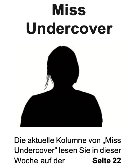 Nachdem unser „Horchemol“ aus Zeitgründen seine Feder leider niederlegen musste, haben wir kurzerhand eine neue, charmante Stimme ins Leben gerufen: „Miss Undercover“. Auch sie ließ uns mit ihrer spitzen Zunge und ihrem wachen Blick an ihrem Alltag teilhaben und unterhielt unsere Leserinnen und Leser auf ihre ganz eigene, unterhaltsame Art. Mit der Einstellung unserer wöchentlichen blätterbaren Ausgabe verabschiedeten wir uns seinerzeit auch von ihr.