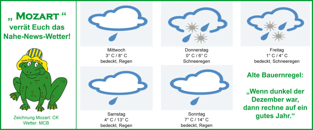 Auch wenn wir Mozart heute nicht mehr als unseren wöchentlichen Wetter-Experten in der illustrierten Form sehen, bleibt er als „Wetterfrosch“ ein liebenswertes Stück Nahe-News-Geschichte. Er erinnert uns an die Anfänge, als wir gemeinsam mit Ihnen den Weg ins digitale Zeitalter der Regionalberichterstattung begonnen haben. Das heutige, aktuelle Wetter-Layout sorgt zwar für präzise Daten rund um die Uhr, aber ein kleines bisschen vermissen wir den „Mozart“-Stil – und natürlich die wöchentlichen Bauernregeln – manchmal doch, nicht wahr? Schreibt uns gerne, wenn ihr euch noch daran erinnert. Mail: feedback@nahe-news.de
