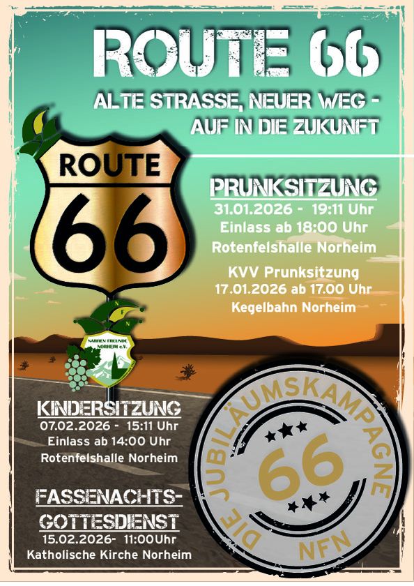 Unter dem Motto „Der NFN hat Geburtstag! Route 66 ! Alte Straße, neuer Weg- auf in die Zukunft..“ finden die Jubiläumsveranstaltungen in der Rotenfelshalle statt.