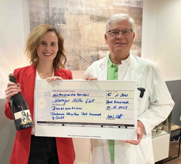 BAD KREUZNACH. Busenfreundinnen trinken gerne ein Glas Sekt miteinander und das prickelnde Getränk steht für Lebensfreude. Das hatte die befreundeten Winzerinnen Eva Müller und Patricia Palums auf die Idee gebracht, einen Sekt für ein karitatives Projekt herzustellen, mit anhaltendem Erfolg. Zum zweiten Mal konnte jetzt Eva Müller einen Spendenscheck an Dr. Gabor Heim, Leiter des Brustkrebszentrums Nahe der Diakonie Kliniken Bad Kreuznach, überreichen. Die Spende soll für die weitere Ausstattung und Verschönerung des Patientinnenzimmers im Brustzentrum der Gynäkologie eingesetzt werden, freute sich Dr. Heim.