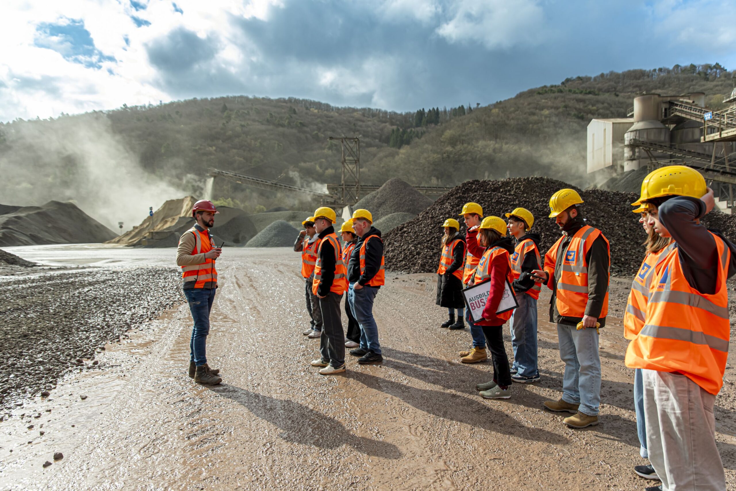 Ein besonderes Highlight war die Handwerksroute: Im Steinbruch der Juchem Holding KG konnten die Schülerinnen und Schüler hautnah erleben, wie Materialien gewonnen, verarbeitet und gesteuert werden. Einblicke in die Schaltzentrale sowie die Möglichkeit, moderne Maschinen kennenzulernen, verdeutlichten die technischen Anforderungen und Entwicklungsmöglichkeiten im Handwerk. Anschließend besuchte die Gruppe die Hahn Bau GmbH in Idar-Oberstein, wo auf einer aktuellen Baustelle die Vielschichtigkeit handwerklicher Prozesse – von Planung bis Umsetzung – anschaulich wurde.