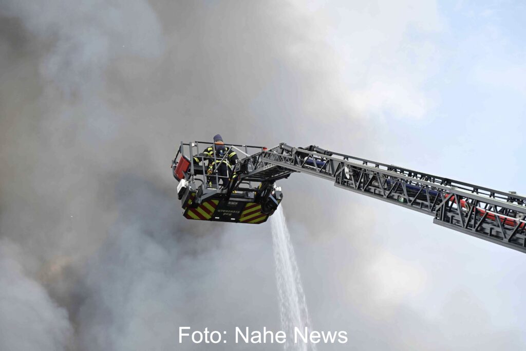 Die Feuerwehr leitete sofort umfangreiche Löschmaßnahmen ein. Über mehrere Strahlrohre wurde der Brand zunächst direkt über das Hallentor bekämpft. Aufgrund der schnellen Brandausbreitung wurde zusätzlich eine sogenannte Riegelstellung aufgebaut, um eine angrenzende Schreinerei zu schützen. Auch zwei Drehleitern kamen zum Einsatz, um das Feuer von oben zu bekämpfen. Ein benachbartes Wohnhaus wurde vorsorglich evakuiert.